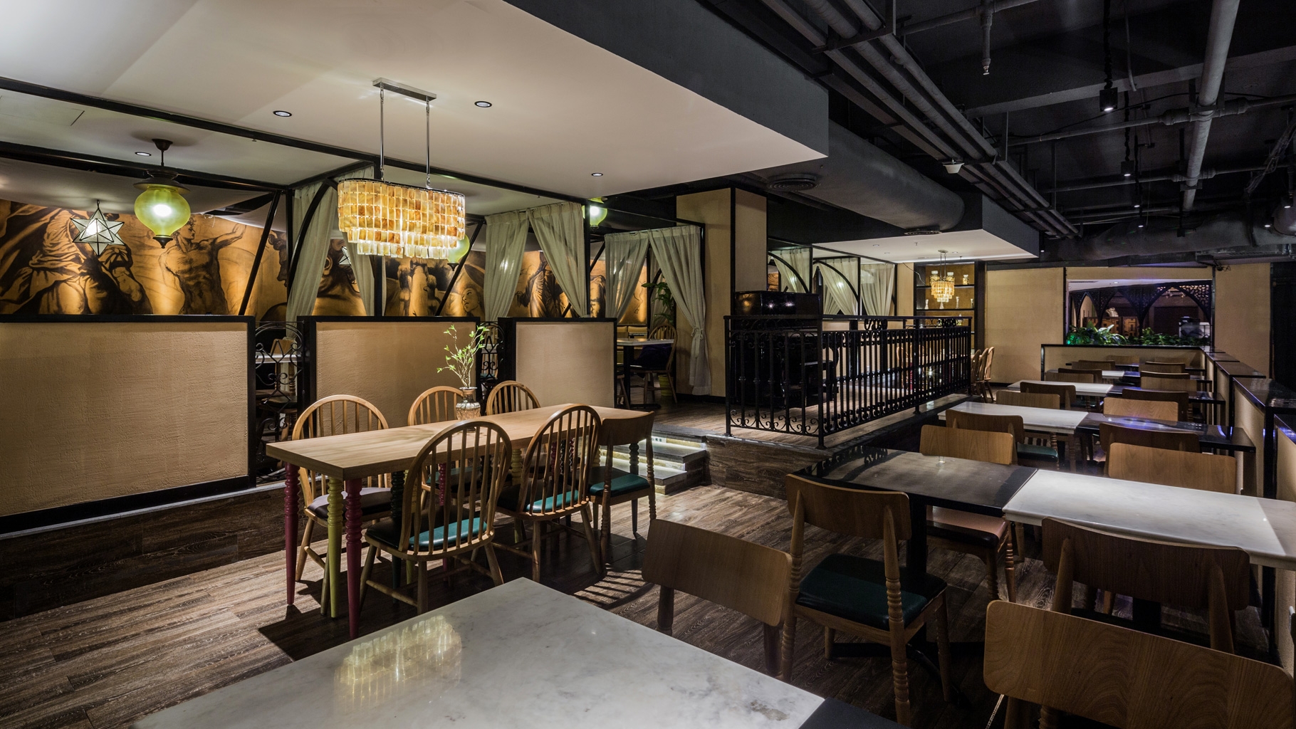 本案位于广州体育西路,自开业以来深受食客们的喜爱,究竟有何秘密,让我们来一起领略一下。虽然本餐饮品牌主要供应中国元素西餐,但是这次设计师在硬装上和软装却融合了阿拉伯沙漠绿洲的异域风情,以及工业风格,与其他众多门店的风格区分开来,营造出令人焕然一新的静谧精致而不失优雅的就餐环境,我们想告诉食客们,除了带给你属于舌尖上美妙的味觉,我们的设计师还能为你打造出一份属于你的中东沙漠韵味。