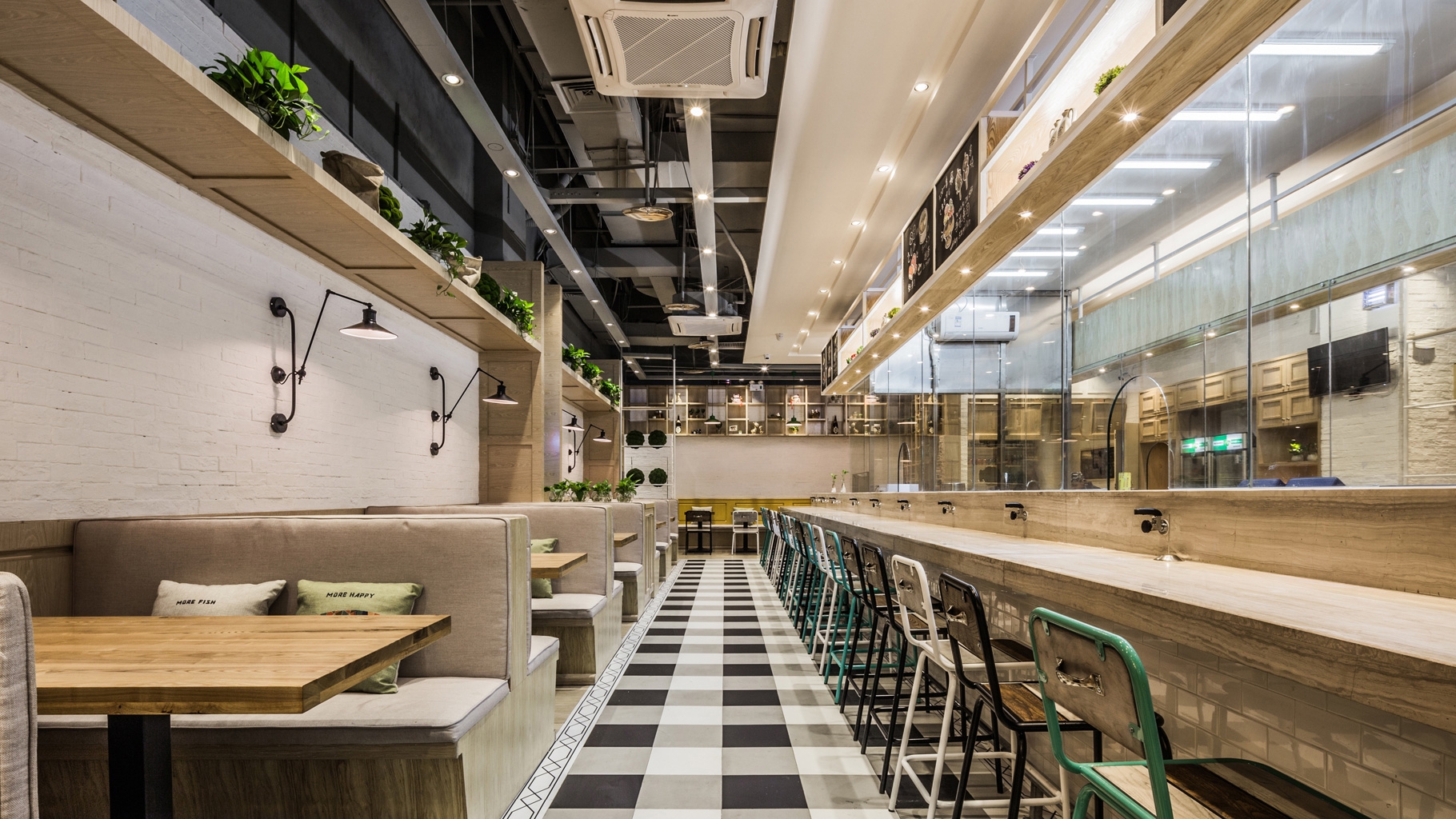 坐在回转寿司桌上,你可以观赏到技艺超群的师傅如何将新鲜的食材制作成一个个美味的佳作,一番寿司坚持精选新鲜食材,承诺带来非凡惊艳的味觉感受。而这次的新店开张,除了满足你的味觉的同时还能满足的视觉。为了能让食客体验到极致的就餐环境,设计师在空间中利用白色的铁艺框架制作出另一个空间,既丰富了视觉空间层次感,同时也为食客打造出一个宁静的就餐区域。另外整个餐厅被设计师巧妙的划分成了多个小就餐区域,无隔断设计,精致的格局,整个餐厅显得更加宽敞明亮起来,并贴心的安排了一系列的亲密就餐区,柠黄色的卡座区域丰富了整个空间的色调,气氛温暖,安宁娴静,让人饱餐一顿美食之后,在这样惬意优雅的环境闲谈一会儿,从繁忙的工作中完全解放出来,享受生活最真实的本质。